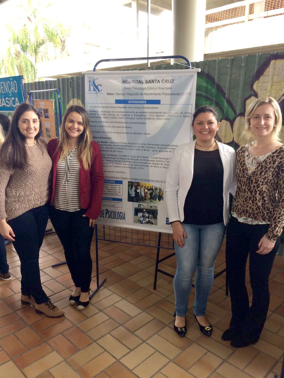 nach, Franciele Moitoso e Rayssa Feldmann, juntamente com a psicóloga e supervisora local Aline Badch Rosa, representaram o Hospital Santa Cruz na 1ª Mostra de Estágio de Psicologia da Universidade de Santa Cruz do Sul (Unisc). O evento foi realizado no Centro de Convivência do campus sede da Instituição de Ensino no dia 28 de setembro.