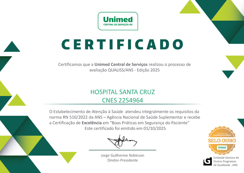 Para a instituição, o reconhecimento reafirma o compromisso com práticas alinhadas às melhores evidências científicas e ao cuidado centrado no paciente, contribuindo para uma rede de saúde mais qualificada e segura. “É uma excelente notícia, estávamos ansiosos por este resultado!”, comemora o diretor-geral Rolf Fredi Molz. “O Hospital Santa Cruz agradece às equipes envolvidas e segue empenhado em avançar na entrega de valor à comunidade e na construção de uma assistência cada vez mais segura, eficiente e humana”, ressalta.