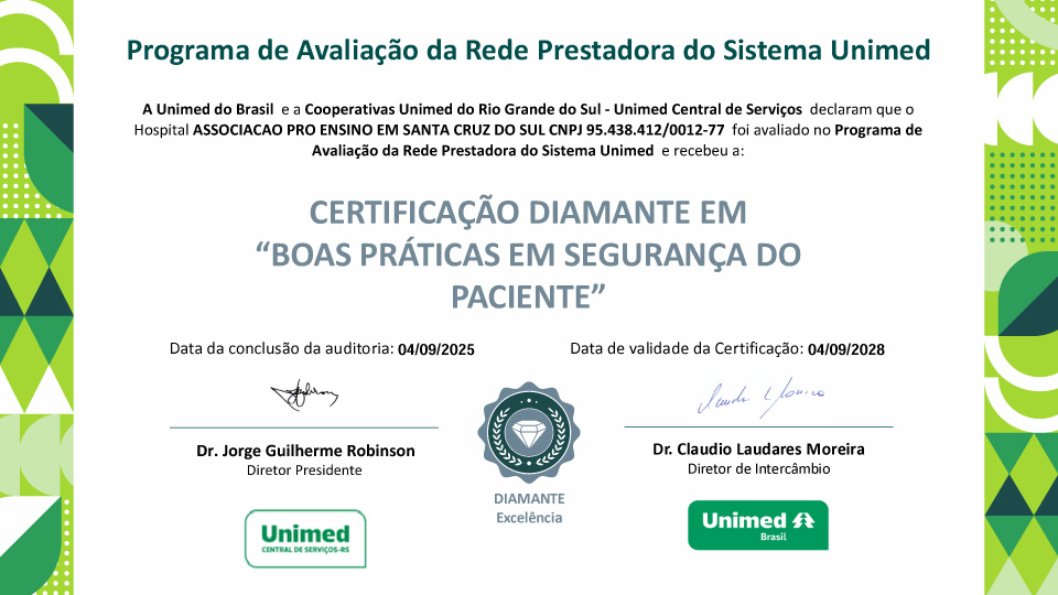 O Hospital Santa Cruz conquistou um dos melhores desempenhos no novo ciclo de avaliação da rede prestadora da Unimed 2025, alcançando o Nível 8 na classificação geral, obtendo o Certificado Diamante em Segurança do Paciente e o Selo Ouro de Certificação Unimed Central de Serviços. Para a direção da casa de saúde, os resultados reforçam a maturidade institucional e o compromisso do hospital com a excelência, a segurança e a qualidade da assistência prestada à comunidade.