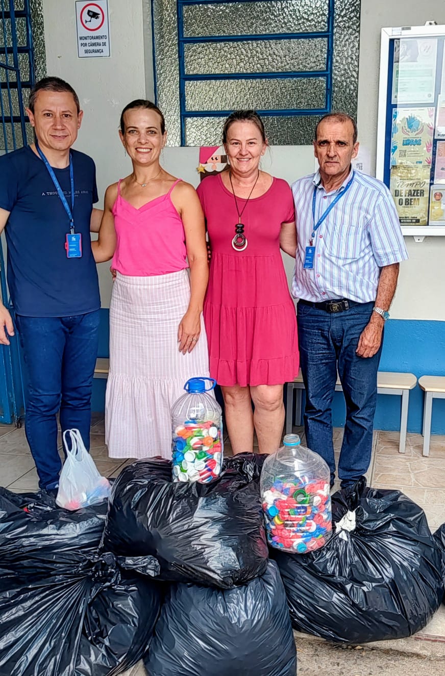 estudantes da Escola Municipal de Ensino Fundamental Duque de Caxias para o Projeto Bem na Tampa. O material foi entregue pelas professoras Carla Kroth e Carine Parnow para o assistente de projetos e captação de recursos do Hospital, Evandro Leal Melo, e para o funcionário Valter Machado Silveira.