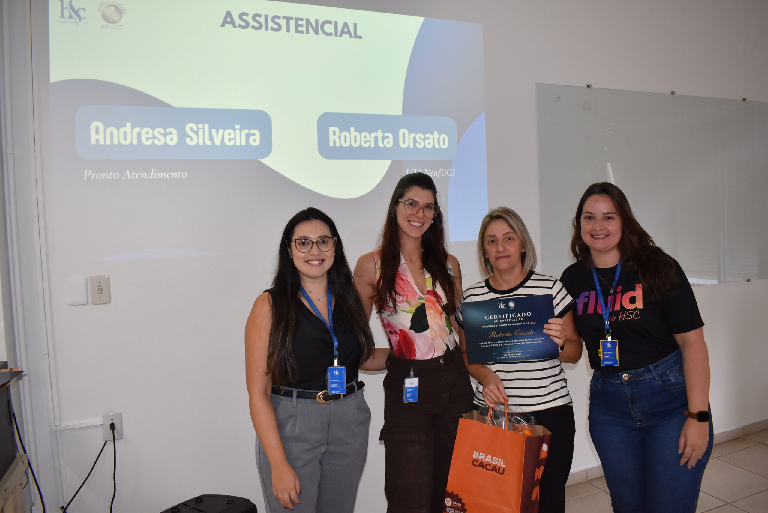Receberam o certificado Giulia de Lima, Daiana Barriquet, Ana Carolina Franceschette, Bruna Leticia da Silva, Andresa Silveira, Roberta Orsato e Daniele de Moraes, além da residente de Medicina Amanda Gabriela Wink. As entregas foram feitas pela equipe de Desenvolvimento Humano e Educação Permanente da Instituição, com a presença da gerente de gestão de pessoas do HSC, Fernanda Haas.