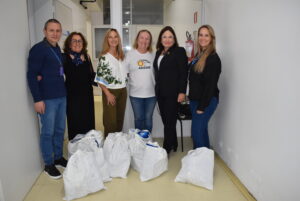 enxoval infantis para a área materno-infantil do Hospital Santa Cruz. A entrega foi feita pelas integrantes Adiles Brixner, Jaciara Basso e Irena Deretti para os assistentes de projetos e captação de recursos do Hospital, Evandro Leal Melo e Tamara Riediger.
