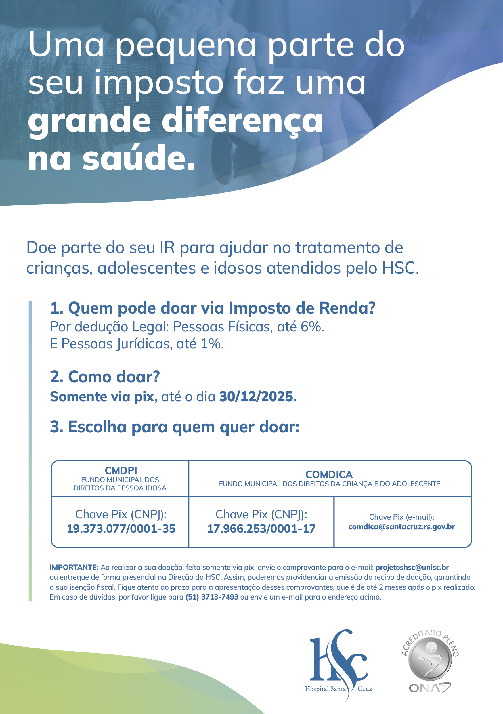 O Hospital Santa Cruz, por meio do Centro de Diagnóstico e Intervenção por Imagem (CDII), promoveu mais uma edição da venda de guarda-chuvas e sombrinhas alusivas à campanha do Outubro Rosa, movimento internacionalmente conhecido pela conscientização acerca do diagnóstico precoce e do tratamento do câncer de mama. A novidade deste ano foi a comercialização de camisetas, que superou as expectativas. Assim como nas edições anteriores da campanha, o resultado obtido com as vendas foi revertido em vouchers de exames de...
