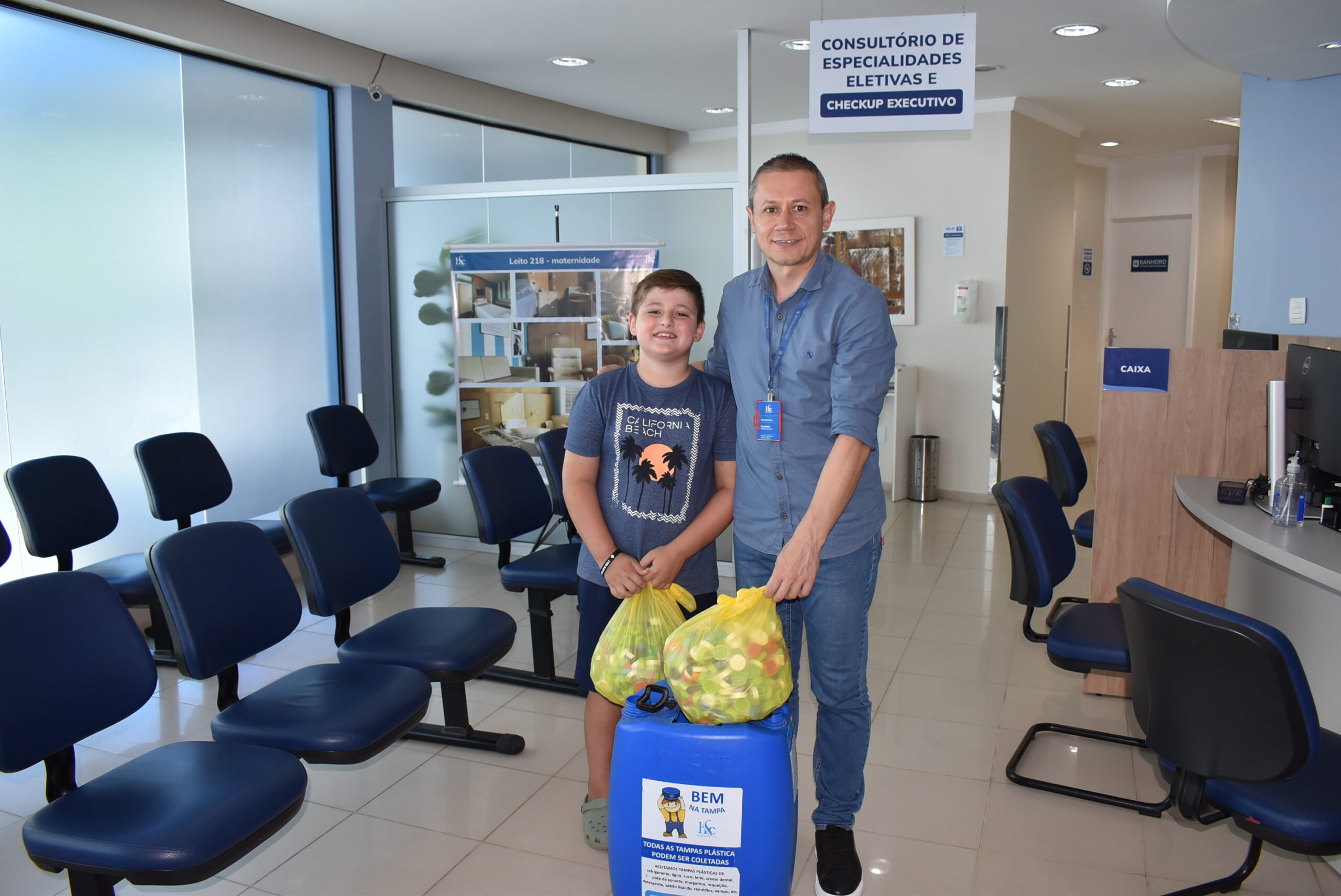O Hospital Santa Cruz recebeu nesta quarta-feira, dia 04, a doação pessoal de tampas plásticas arrecadadas por Miguel Leseux Piran, de 8 anos, para o Projeto Bem na Tampa da Instituição. O material foi entregue por ele e sua mãe, Merindiana Leseux Piran, para o assistente de projetos e captação de recursos do Hospital, Evandro Leal Melo. Para participar do projeto basta juntar lacres metálicos e tampas plásticas de qualquer tipo (refrigerantes, sorvete, creme dental, margarina, café, produtos de limpeza...