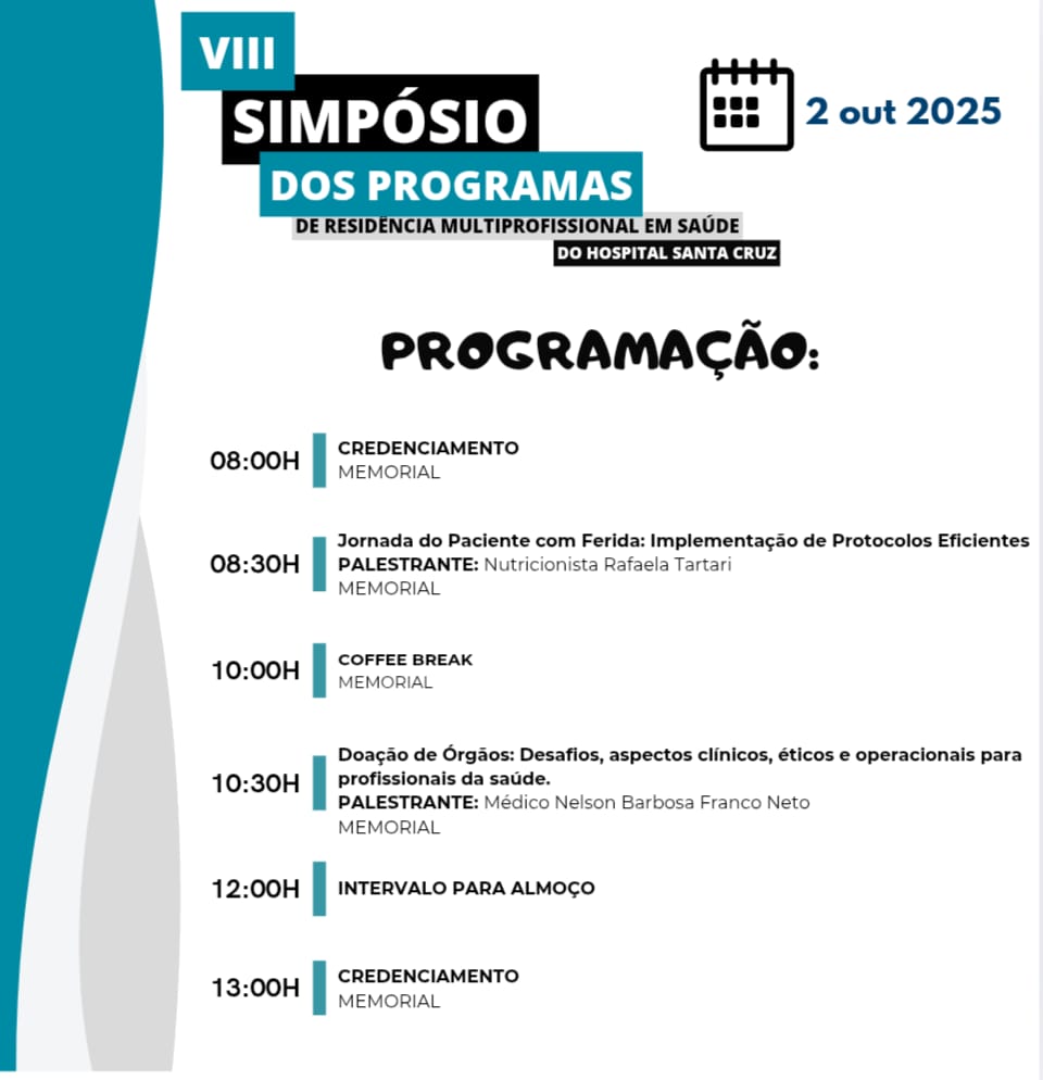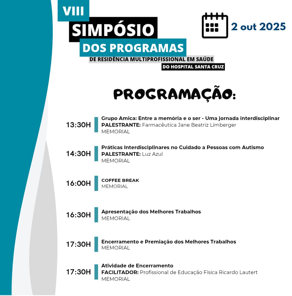 VIII Simpósio dos Programas de Residência Multiprofissional em Saúde do Hospital Santa Cruz Data / Hora Date(s) - 01/10/2025 - 02/10/2025TODO DIA Para informações completas e inscrições ACESSE AQUI.